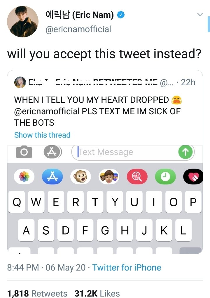 While some artists are active on tik tok , some on Instagram , some on V Live , Eric Nam shared his number with his fans and has his fans got excited with his sudden texts and replies.